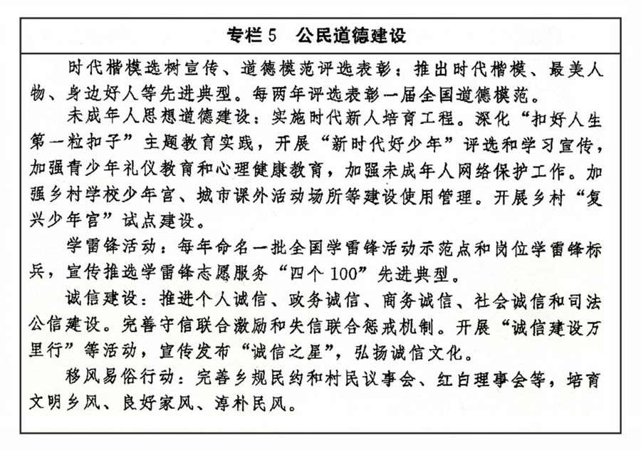 傳承弘揚中華傳統(tǒng)美德,加強社會公德、職業(yè)道德、家庭美德、個人品德建設(shè),加強家庭、家教、家風建設(shè)。加強對革命、建設(shè)、改革時期各類先進典型的學習宣傳,尊崇褒揚英雄模范,關(guān)心關(guān)愛先進典型人物。健全家庭、學校、政府、社會相結(jié)合的思想道德教育體系,把立德樹人貫穿學校教育全過程。發(fā)揮優(yōu)秀文化產(chǎn)品陶冶道德情操的作用,完善市民公約、鄉(xiāng)規(guī)民約、學生守則、團體章程等社會規(guī)范,廣泛開展弘揚時代新風行動,深化道德領(lǐng)域突出問題治理。加強農(nóng)村思想道德建設(shè),創(chuàng)新文化科技衛(wèi)生“三下鄉(xiāng)”長效機制。