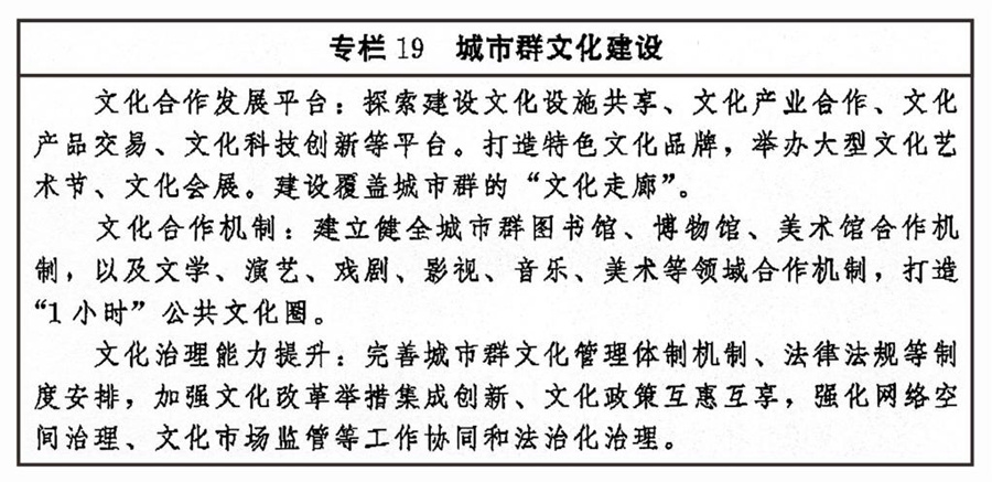 加強區(qū)域文化協(xié)同創(chuàng)新,健全合作互助、扶持補償機制,推動東部地區(qū)以創(chuàng)新引領(lǐng)文化發(fā)展,加大力度支持中西部地區(qū)以及東北等老工業(yè)基地文化發(fā)展,扶持革命老區(qū)、民族地區(qū)、邊疆地區(qū)文化發(fā)展,形成相互促進、優(yōu)勢互補、融合互動的區(qū)域文化發(fā)展格局。圍繞京津冀協(xié)同發(fā)展、長江經(jīng)濟帶發(fā)展、粵港澳大灣區(qū)建設(shè)、長三角一體化發(fā)展、黃河流域生態(tài)保護和高質(zhì)量發(fā)展等區(qū)域重大戰(zhàn)略,健全推進區(qū)域內(nèi)文化協(xié)同發(fā)展機制,提升公共文化設(shè)施互聯(lián)互通水平,加強區(qū)域文化產(chǎn)業(yè)帶建設(shè),實現(xiàn)區(qū)域文化建設(shè)水平整體提高。促進形成文化產(chǎn)業(yè)發(fā)展新格局,創(chuàng)新城市群文化一體化發(fā)展體制機制,共建高水平合作平臺,加強公共文化服務(wù)便利共享。完善以城帶鄉(xiāng)、城鄉(xiāng)融合的文化發(fā)展體制機制,發(fā)揮城市帶動輻射作用,加快城鄉(xiāng)間文化要素雙向流動,形成以點帶面、特色鮮明、優(yōu)勢互補、均衡配置的城鄉(xiāng)文化發(fā)展新格局。
