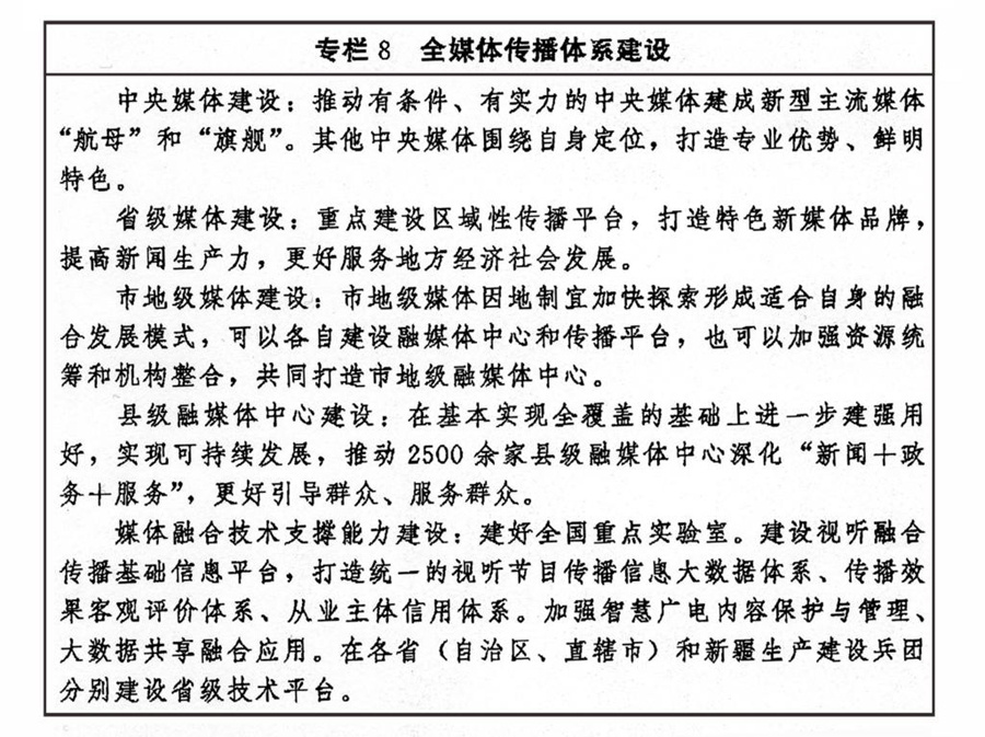加快推進媒體深度融合發(fā)展,有效整合各種媒介資源、生產(chǎn)要素,推動在信息內(nèi)容、技術(shù)應用、平臺終端、管理手段等方面共融互通,打造一批具有強大影響力、競爭力的新型主流媒體。統(tǒng)籌處理好傳統(tǒng)媒體和新興媒體、中央媒體和地方媒體、主流媒體和商業(yè)平臺、大眾化媒體和專業(yè)性媒體的關(guān)系,建立以內(nèi)容建設(shè)為根本、先進技術(shù)為支撐、創(chuàng)新管理為保障的全媒體傳播體系。推進內(nèi)容生產(chǎn)供給側(cè)結(jié)構(gòu)性改革,完善高質(zhì)量內(nèi)容產(chǎn)出機制,推廣互動式、服務(wù)式、場景式傳播。強化新一代信息技術(shù)支撐引領(lǐng)作用,支持主流媒體重塑采編流程、建設(shè)平臺終端、優(yōu)化管理手段、強化版權(quán)保護、打造媒體資源數(shù)據(jù)庫、提升內(nèi)容生產(chǎn)力、占據(jù)傳播制高點。創(chuàng)新媒體業(yè)態(tài)、傳播方式和運營模式,強化用戶連接,發(fā)揮制度優(yōu)勢和市場作用,增強主流媒體競爭力。