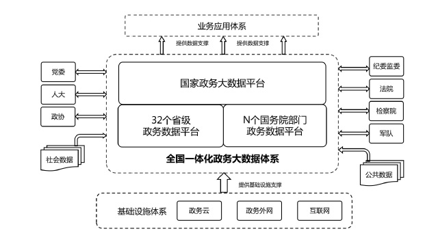 全國(guó)一體化政務(wù)大數(shù)據(jù)體系包括三類平臺(tái)和三大支撐。三類平臺(tái)為“1+32+N”框架結(jié)構(gòu)?!?”是指國(guó)家政務(wù)大數(shù)據(jù)平臺(tái),是我國(guó)政務(wù)數(shù)據(jù)管理的總樞紐、政務(wù)數(shù)據(jù)流轉(zhuǎn)的總通道、政務(wù)數(shù)據(jù)服務(wù)的總門(mén)戶;“32”是指31個(gè)?。ㄗ灾螀^(qū)、直轄市)和新疆生產(chǎn)建設(shè)兵團(tuán)統(tǒng)籌建設(shè)的省級(jí)政務(wù)數(shù)據(jù)平臺(tái),負(fù)責(zé)本地區(qū)政務(wù)數(shù)據(jù)的目錄編制、供需對(duì)接、匯聚整合、共享開(kāi)放,與國(guó)家平臺(tái)實(shí)現(xiàn)級(jí)聯(lián)對(duì)接;“N”是指國(guó)務(wù)院有關(guān)部門(mén)的政務(wù)數(shù)據(jù)平臺(tái),負(fù)責(zé)本部門(mén)本行業(yè)數(shù)據(jù)匯聚整合與供需對(duì)接,與國(guó)家平臺(tái)實(shí)現(xiàn)互聯(lián)互通,尚未建設(shè)政務(wù)數(shù)據(jù)平臺(tái)的部門(mén),可由國(guó)家平臺(tái)提供服務(wù)支撐。三大支撐包括管理機(jī)制、標(biāo)準(zhǔn)規(guī)范、安全保障三個(gè)方面。