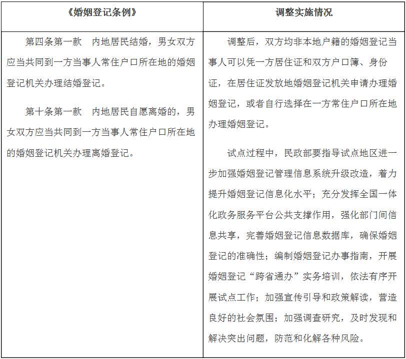 國務院決定在內(nèi)地居民婚姻登記“跨省通辦”試點地區(qū)暫時調(diào)整實施《婚姻登記條例》有關(guān)規(guī)定目錄