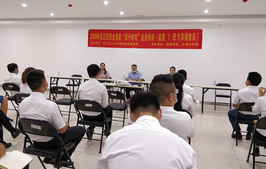 近日,由百色市右江區(qū)人力資源和社會保障局主辦,廣西百色益嘉職業(yè)技能培訓(xùn)學(xué)校、右江區(qū)新姿投資股份有限公司承辦的2020年右江區(qū)職業(yè)技能“雙千結(jié)對”企業(yè)培訓(xùn)(益嘉1班汽車銷售員)在千姿汽車城順利開班,培訓(xùn)期十天,約50名汽車銷售人員參加培訓(xùn)。