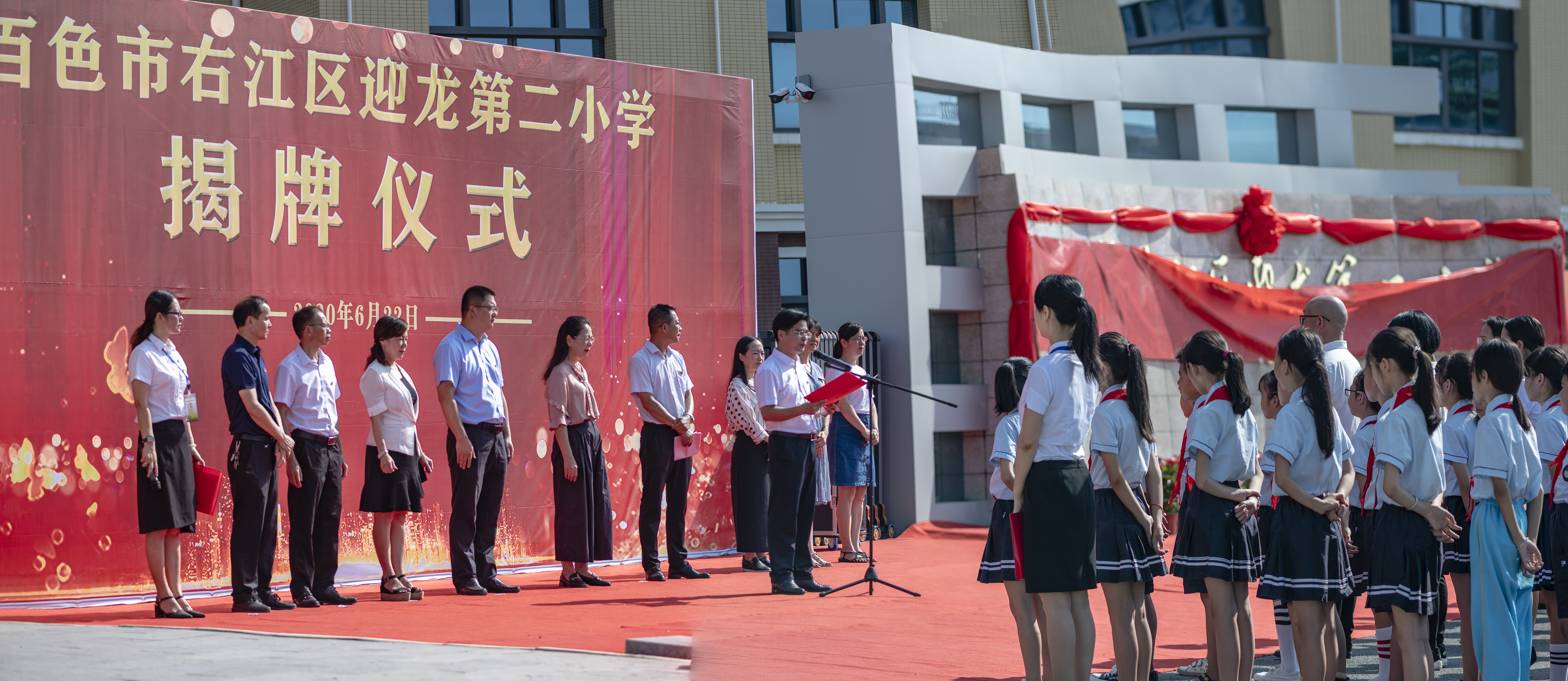 ????6月22日上午,百色市右江區(qū)迎龍第二小學(xué)揭牌儀式在該校大門(mén)舉行,標(biāo)志著這所由廣西百色益眾投資有限公司承建的小學(xué)全面交付使用。
