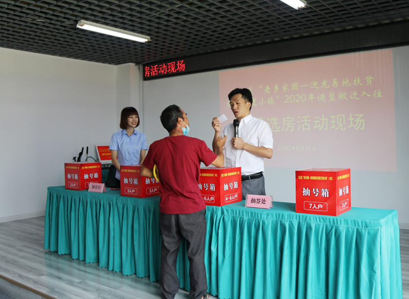 6月14日,右江區(qū)“老鄉(xiāng)家園—迎龍易地扶貧搬遷安置小鎮(zhèn)”2020年調(diào)整搬遷入住工作拉開了序幕。當日上午,符合本次新調(diào)入搬遷對象的搬遷戶在益眾公司老鄉(xiāng)家園(益眾.尚城商業(yè)樓B1棟)辦公區(qū)舉行現(xiàn)場抽號選房、簽約手續(xù)。