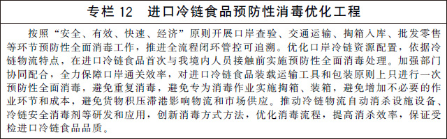 健全檢驗檢測檢疫體系。適應(yīng)不同農(nóng)產(chǎn)品檢驗檢測檢疫要求,完善覆蓋從種養(yǎng)殖、加工到銷售終端全鏈條以及冷鏈物流包裝、運(yùn)載工具、作業(yè)環(huán)境等全要素的檢驗檢測檢疫體系。加強(qiáng)檢驗檢測檢疫設(shè)施建設(shè)和設(shè)備配置,完善應(yīng)急檢驗檢測檢疫預(yù)案,實行閉環(huán)式疫情防控管理,防范非洲豬瘟、新冠肺炎、禽流感等疫情擴(kuò)散風(fēng)險,提高重大公共衛(wèi)生事件等應(yīng)急處置能力。
