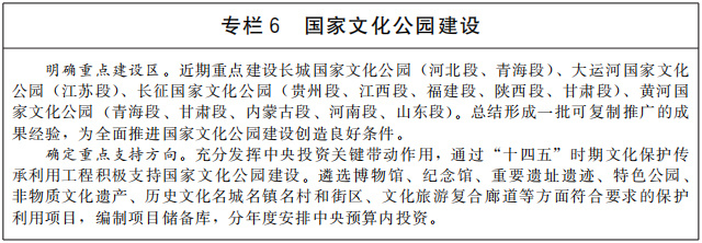推進(jìn)國家文化公園建設(shè),生動(dòng)呈現(xiàn)中華文化的獨(dú)特創(chuàng)造、價(jià)值理念和鮮明特色,樹立和突出各民族共享的中華文化符號和中華民族形象,探索新時(shí)代文物和文化資源保護(hù)傳承利用新路徑,把國家文化公園建設(shè)成為傳承中華文明的歷史文化走廊、中華民族共同精神家園、提升人民生活品質(zhì)的文化和旅游體驗(yàn)空間。加快建設(shè)長城、大運(yùn)河、長征、黃河等國家文化公園,整合具有突出意義、重要影響、重大主題的文物和文化資源,重點(diǎn)建設(shè)管控保護(hù)、主題展示、文旅融合、傳統(tǒng)利用四類主體功能區(qū),實(shí)施保護(hù)傳承、研究發(fā)掘、環(huán)境配套、文旅融合、數(shù)字再現(xiàn)五大工程,突出“萬里長城”“千年運(yùn)河”“兩萬五千里長征”“九曲黃河”整體辨識度。推進(jìn)優(yōu)質(zhì)文化旅游資源一體化開發(fā),科學(xué)規(guī)劃、開發(fā)文化旅游產(chǎn)品和商品。推出參觀游覽聯(lián)程聯(lián)運(yùn)經(jīng)典線路,開展整體品牌塑造和營銷推介。